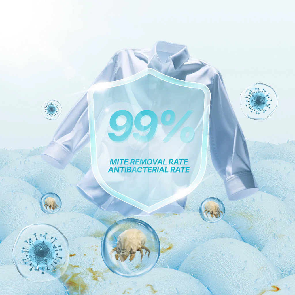 Recupera el brillo de tus prendas blancas. Tecnología anti-grisáceo, elimina bacterias y ácaros hasta el 99%